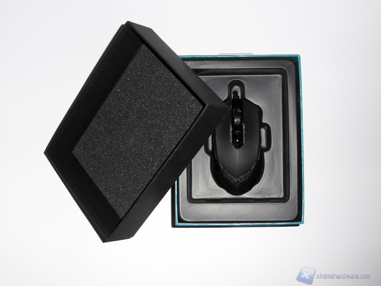 Sul lato anteriore della confezione esterna troviamo un'immagine raffigurante il mouse e il modello, viene evidenziata la presenza di un sensore laser, la memory on board e la possibilità di cambiare risoluzione del sensore on the fly. La parte posteriore riporta invece le caratteristiche del mouse. In alto vengono evidenziati alcuni aspetti come i due chassis intercambiabili, le massette con il contenitore dove riporle ed alcune informazioni sui pulsanti disponibili su di esso.