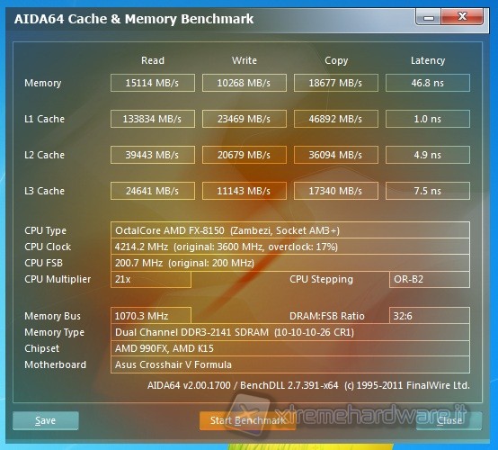 Abbiamo notato che questo software non fornisce attualmente risultati del tutto corretti, in quanto effettuando il benchmark sulle memorie spesso abbiamo notato una ve locità della cache L2 spesso inferiore alla cache L3 nella CPU AMD FX-8150. Tale comportamento ci sembra del tutto anomalo: anche se la cache L3 è di tipo esclusivo, è generalmente molto più lenta della L2. Di seguito vi proponiamo una screen che evidenzia tale situazione, nella schermata le memorie erano impostate ad una frequenza di 2133 MHz circa:
